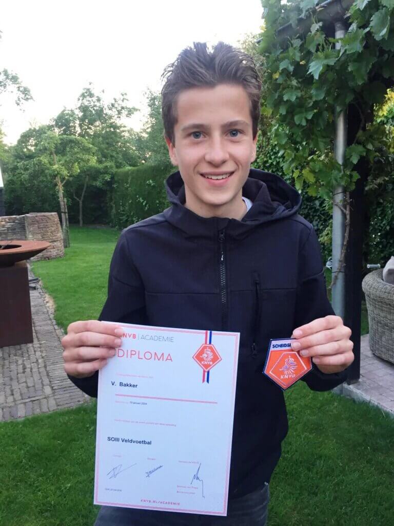 Valentijn Bakker, een van onze eigen jeugdscheidsrechters, heeft vandaag zijn SOIII veldvoetbal diploma gehaald. Voor het behalen van deze diploma heeft hij vier bijeenkomsten moeten volgen waarbij hij ook wedstrijden heeft moeten fluiten die door de KNVB zijn aangesteld. Tijdens deze wedstrijden is hij beoordeeld door een praktijdbegeleider.