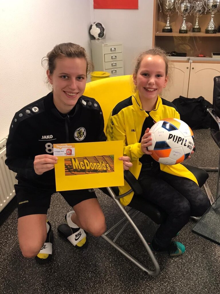 Om 14:00 uur moest ik me melden bij de bestuurskamer en daar kreeg ik het trainingspak en de warme jas van de Pupil van de Week. Hierna ging ik naar de kleedkamer waar de meiden vooral naar hele harde muziek aan het luisteren waren, heel gezellig.
