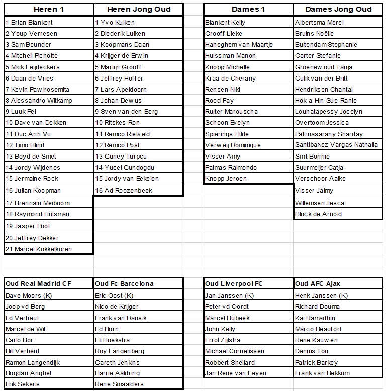 Zaterdag 4 januari vindt het grote spektakel plaats: vele oud-spelers en speelsters zullen laten zien dat zij het voetbalspelletje nog lang niet verleerd zijn. Er is een geweldige aanmelding geweest, zodat er niet alleen gespeeld wordt tussen het huidige 1ste elftal en “jong-oud” (zowel bij de mannen als bij de vrouwen!), maar er zijn ook maar liefst 4 teams van oud-oud-spelers die elkaar in partijtjes van 8 tegen 8 zullen proberen de loef af te speken, te snel af te zijn en diverse “pannaatjes” te plaatsen. Kortom, een aanrader om dat te komen zien.