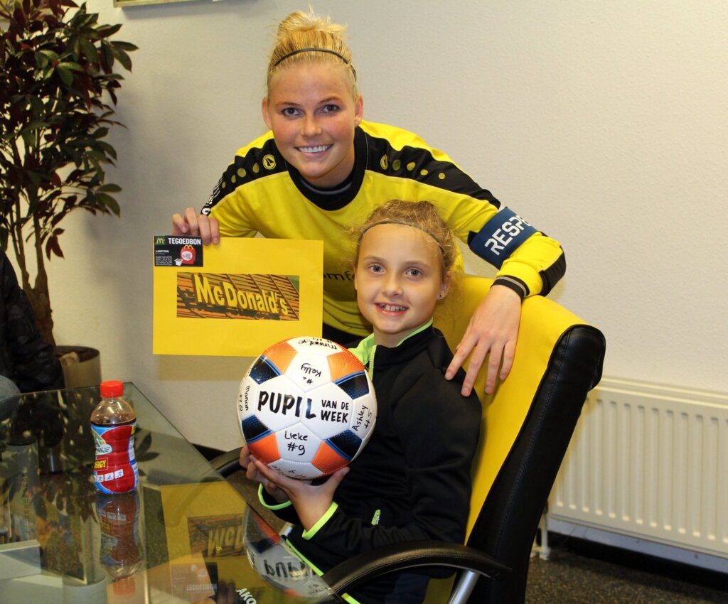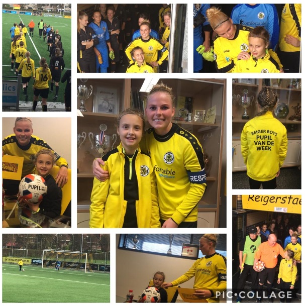 Wat was ik blij toen ik hoorde dat ik Pupil van de Week mocht zijn. Ik kon de hele week niet wachten tot het zover was. Eerst had ik zelf nog een voetbalwedstrijd waar ik voor het eerst heb gescoord! We hadden met 2-5 gewonnen! Toen de wedstrijd was afgelopen moest ik heel snel vanuit de Beemster naar Reiger Boys om Vrouwen 1 te ontmoeten. Ik had er heel veel zin in maar was ook wel een beetje zenuwachtig. We gingen eerst naar de bestuurskamer en daar kreeg ik het trainingspak aan van Pupil van de Week. Daarna werd ik naar de dames van het eerste team gebracht. Ik vond het heel leuk om ze te ontmoeten. Ik mocht mee naar de kleedkamer en daarna gingen we de warming up doen. Vlak voordat de wedstrijd begon gingen we nog even terug naar de kleedkamer. Toen gingen we samen met SC Stiens uit Friesland het veld op. Eerst gingen we handjes schudden en daarna mocht ik de aftrap nemen en scoren yeah! Wat vond ik dat gaaf dat ik het eerste doelpunt mocht scoren!! Maar helaas telde dit doelpunt niet mee met de wedstrijd.