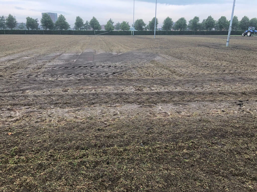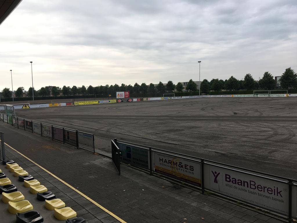 Na enkele dagen van voorbereidende werkzaamheden is het vandaag echt begonnen. Vanaf 8 uur vanmorgen zijn telkens stukken van ruim 45 meter kunstgras uitgesneden, opgerold en daarna vervolgens naar het parkeerterrein afgevoerd. Een klusje die tot ver in de middag heeft geduurd. Op de foto, die vanavond gemaakt is, is te zien dat al het kunstgras is verwijderd. Daarnaast is maandag ook begonnen met het onderhoud van velden 2 en 3. Daar is inmiddels bijna geen grasspriet meer op te vinden.