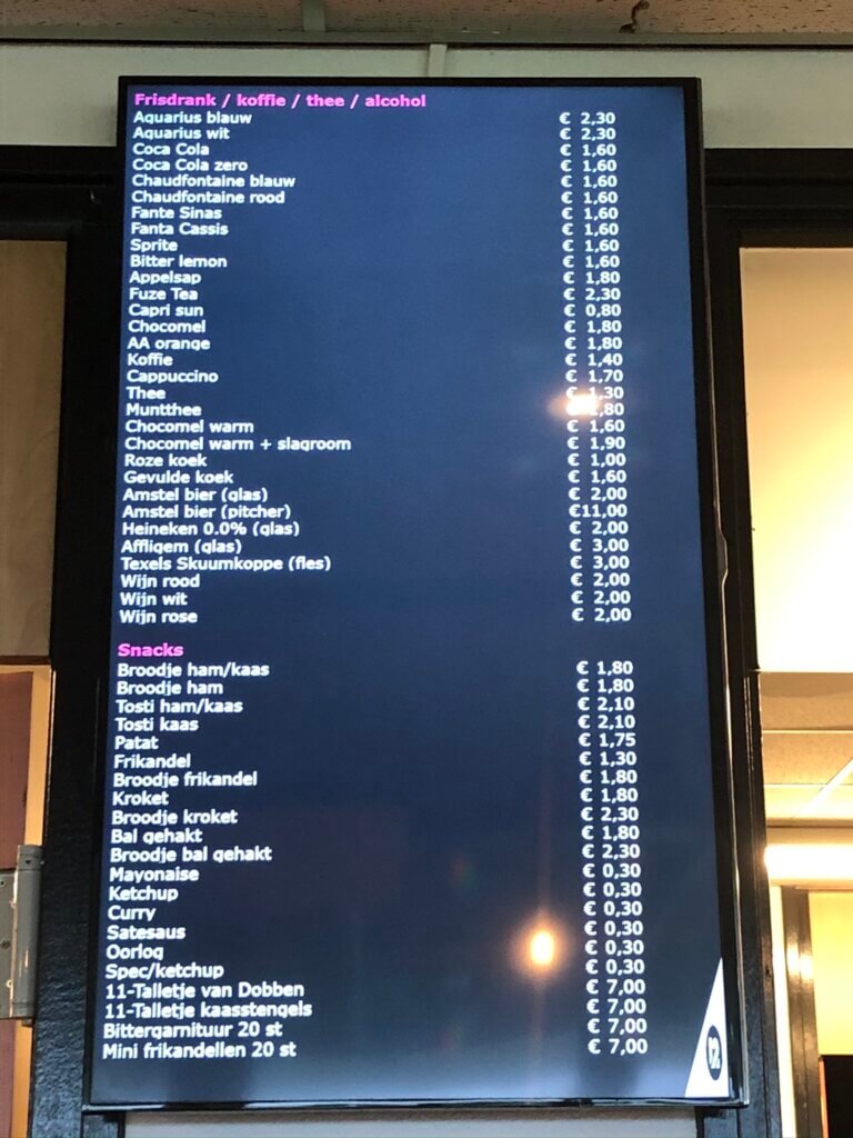 We hebben een aantal zaken van onze wensenlijst gerealiseerd. Zo zijn er nieuwe lampen boven de bar en extra inbouwspots achter de bar. Nu staan we dus allemaal in de spotlights. Er is een digitale prijslijst opgehangen. De lijst is gekoppeld aan ons kassasysteem waardoor we snel en eenvoudig producten of prijzen kunnen aanpassen.