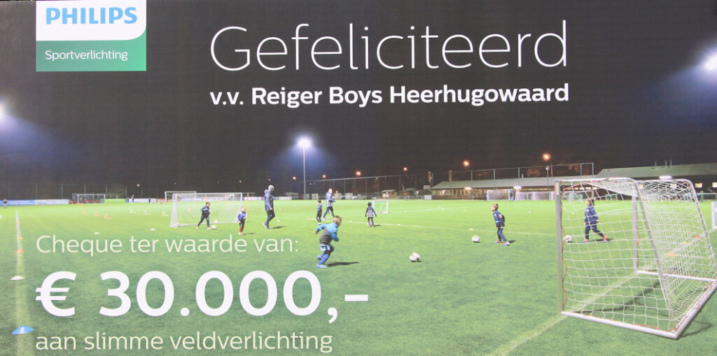 Voetbalvereniging Reiger Boys heeft als winnaar van “Win Sportveldverlichting” voor maar liefst € 30.000,– aan sportveldverlichting gewonnen. Deze wedstrijd, georganiseerd door Signify, werd uitgeschreven voor sportclubs. Het bestuur van Reiger Boys besloot mee te doen want een voetbalclub in één van de meest duurzame wijken, namelijk De Stad van de Zon, kan niet duurzaam genoeg zijn. De LED verlichting is dan ook meer dan welkom. Het hoofdveld krijgt binnenkort OptiVision LED-armaturen, voorzien van de Interact Sports Field Lighting applicatie. Hiermee bedienen ze voortaan de verlichting met een eenvoudige swipe. En dankzij de energie-efficiënte LED-verlichting bespaart de club heel wat geld op de elektriciteitsfactuur.