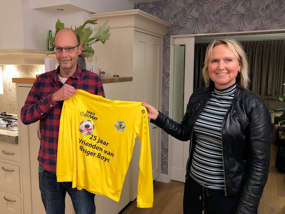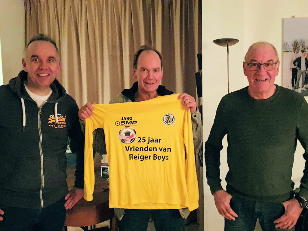 Als zij wat ontdooid zijn komt de aap uit de mouw: zij komen, als verrassing, met de felicitaties voor het 25-jarig bestaan van “De Vrienden van Reiger Boys” en onderstrepen die felicitaties met een origineel cadeau: een Reiger Boys-shirt met de opdruk “25 jaar Vrienden van Reiger Boys” en het bijbehorende logo van De Vrienden. Het was eigenlijk de bedoeling geweest om dit shirt op 10 december uit te reiken aan de bestuursleden van De Vrienden, tijdens de speciale avond die De Vrienden (samen met de sponsorcommissie) hadden georganiseerd, maar die vanwege de corona perikelen helaas moest worden uitgesteld tot nader order.