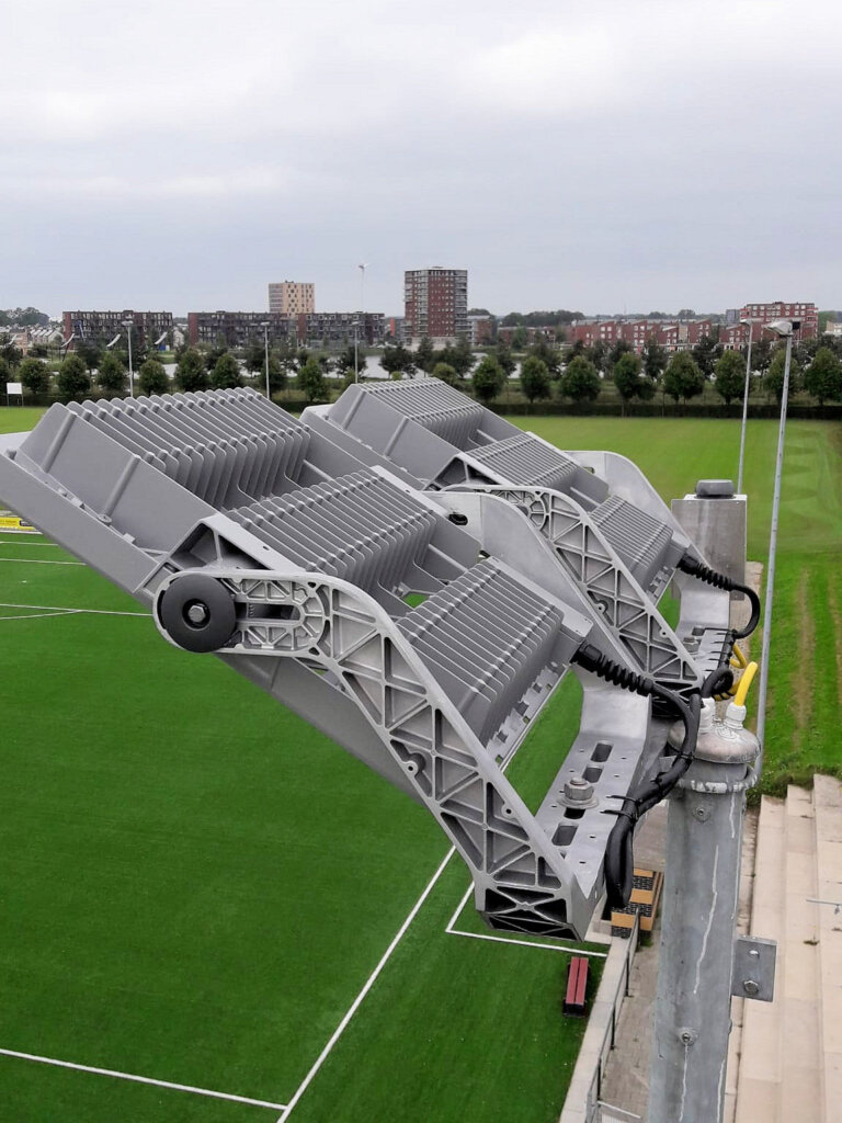 De afgelopen dagen zijn de mannen van Pilkes uit Stompetoren druk bezig geweest met de montage van de nieuwe led-verlichting op ons complex. Inmiddels zijn alle oude armaturen van de masten verwijderd en daarvoor zijn nieuwe led-armaturen voor in de plaats gekomen.