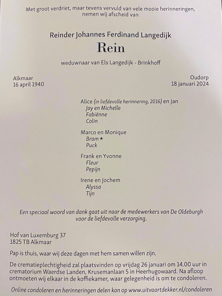 Wij hebben het bericht ontvangen dat gisteren Rein Langedijk op 83 jarige leeftijd is overleden.