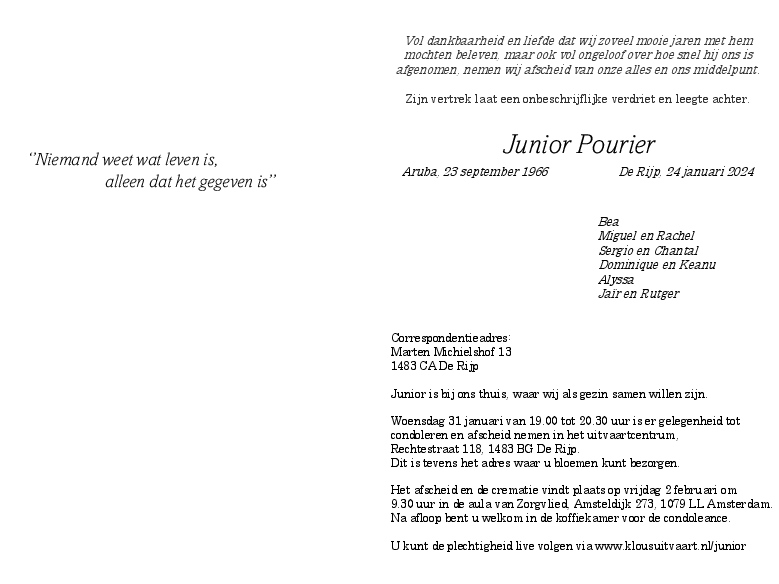 Met ongeloof bereikte ons afgelopen donderdag het droevige nieuws dat Junior Pourier is overleden.