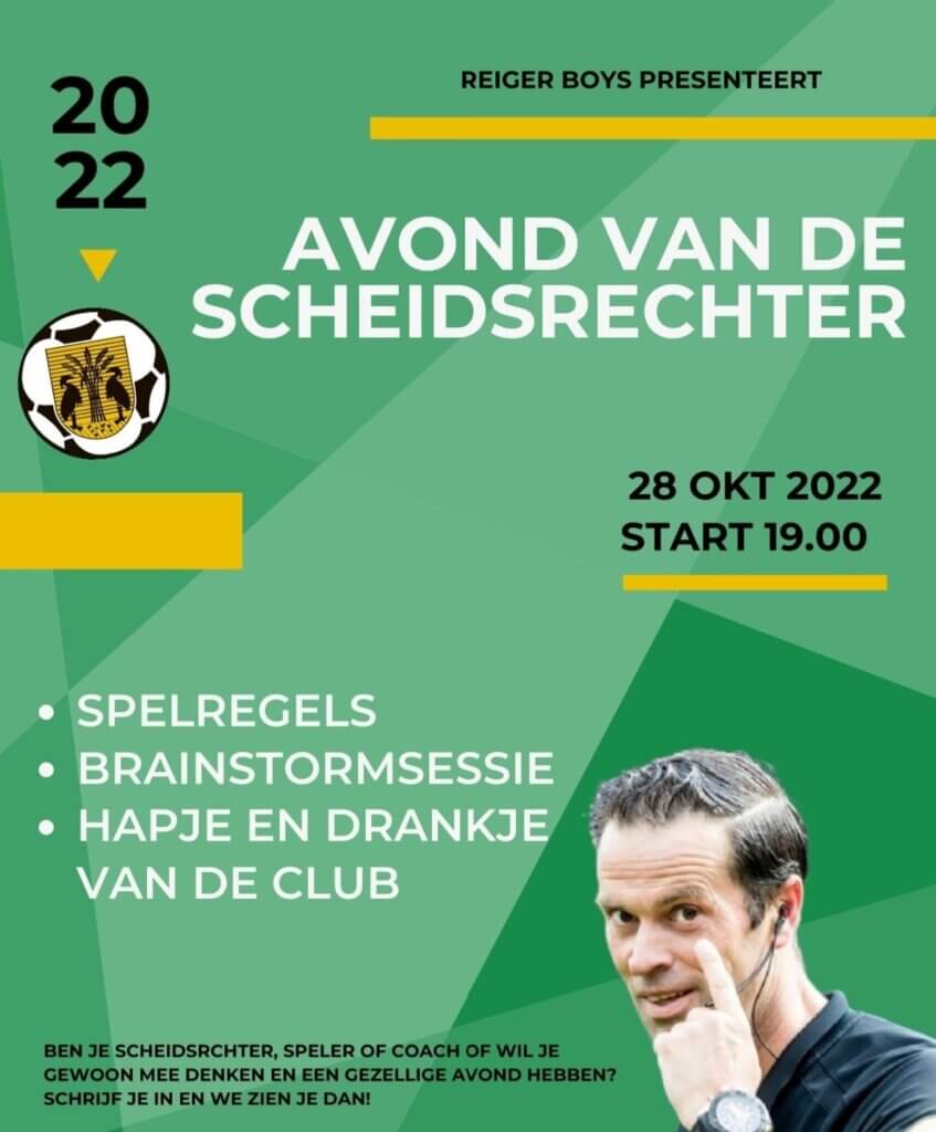 28 oktober is het dan zover! De scheidsrechtersavond van Reiger Boys. Deze avond zal onder het genot van een hapje en een drankje de scheidsrechter in de meest brede zin van het woord centraal staan. Zo zal er deze avond gesproken worden over verschillende thema’s, zoals spelregels, nieuwe regels en zal er tijd zijn om…