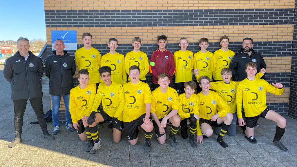 Vanmorgen is deze foto gemaakt van Reiger Boys JO15-3 met het logo van teamsponsor Denticien uit Alkmaar als teamsponsor.
