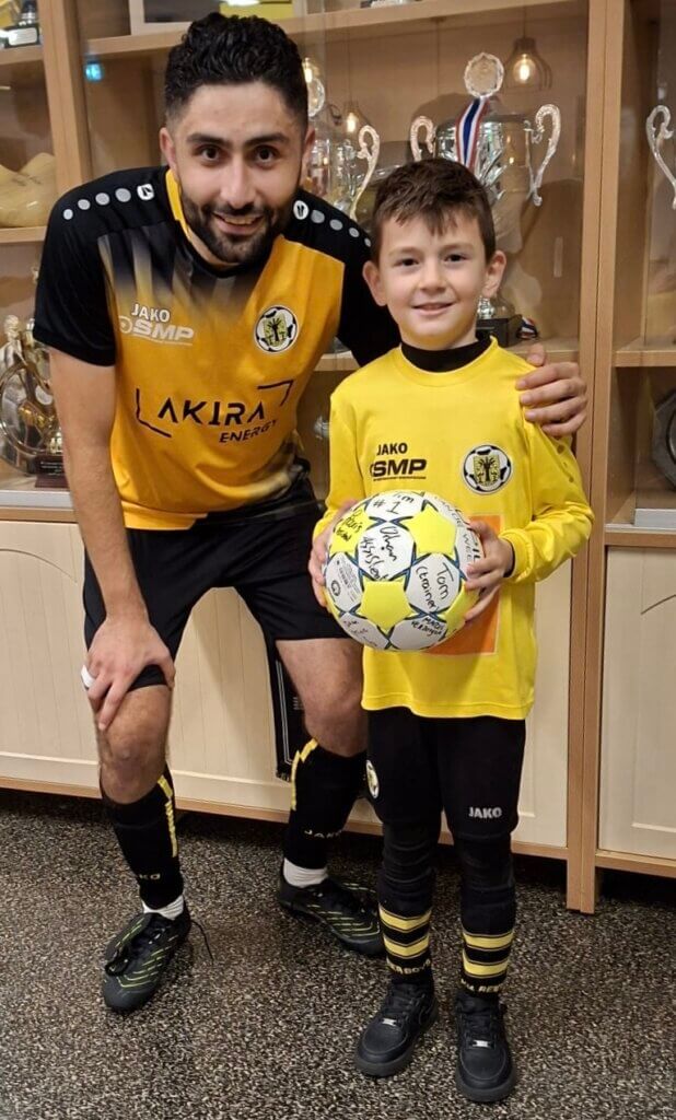 Na de wedstrijd mocht ik mee naar de bestuurskamer. Daar kreeg ik lekkere patat en een drankje. Maar het allerleukste van alles: ik kreeg een bal met alle handtekening van het team erop.