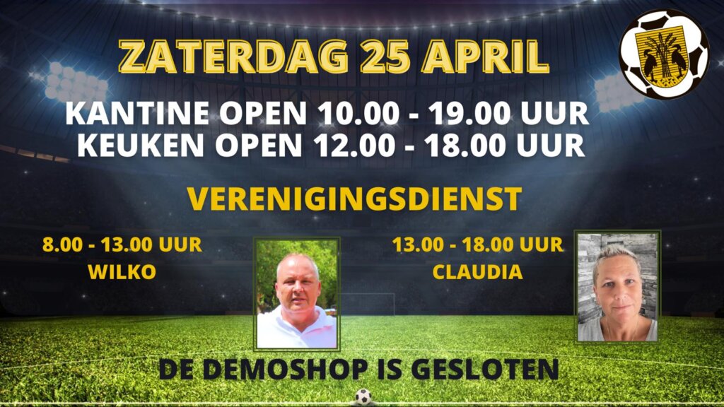 Kantine, verenigingsdienst en demoshop zaterdag 25 april