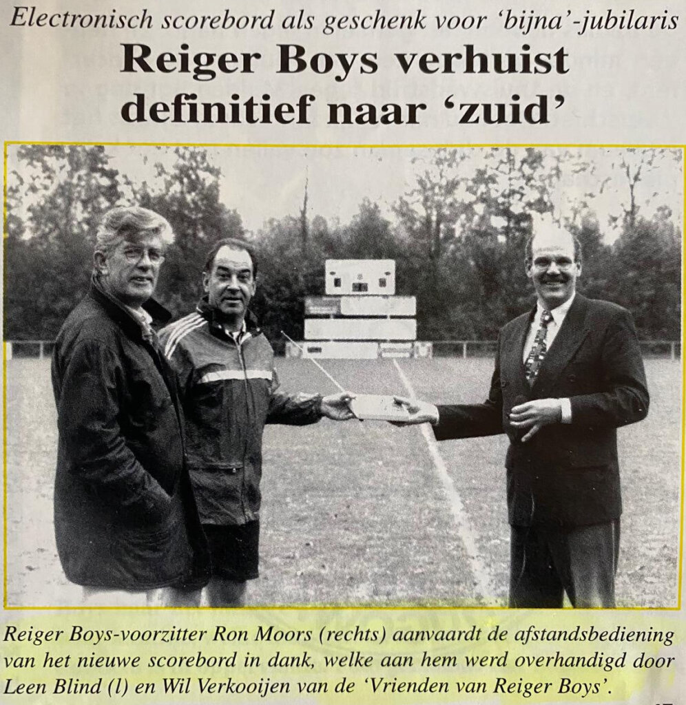 Wat misschien alleen oudere leden weten, is dat het huidige scorebord al in gebruik was op het oude complex aan de Beukenlaan en destijds is geschonken door de Vrienden van Reiger Boys. Bij de verhuizing naar sportpark De Wending is het scorebord meeverhuisd en het wordt nog steeds gebruikt, met name bij wedstrijden van Heren 1 en Vrouwen 1. De laatste tijd echter zonder tijdweergave, aangezien dit onderdeel defect is geraakt en niet meer te herstellen.