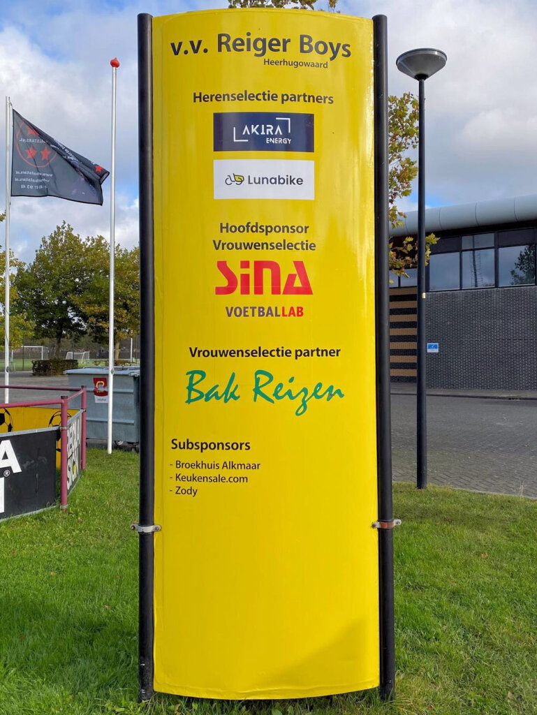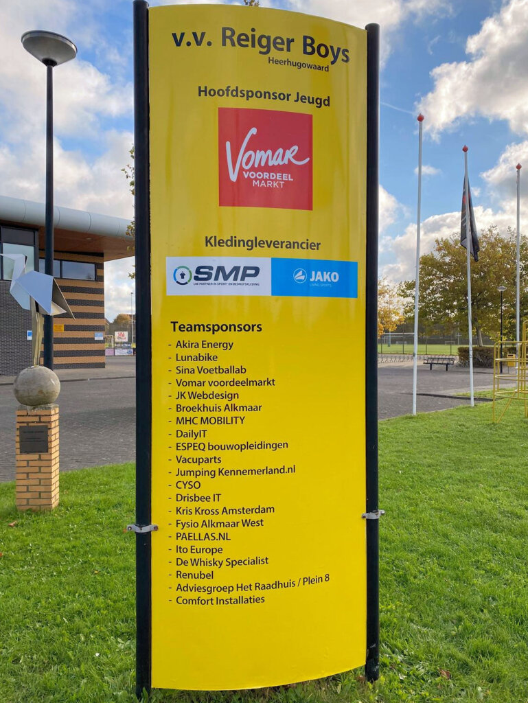Vanmorgen zijn door onze sponsor en leverancier Reclasign de sponsorzuilen bij de ingang van het complex weer opnieuw beplakt. Alle huidige sponsoren en partners zijn hierop zichtbaar.