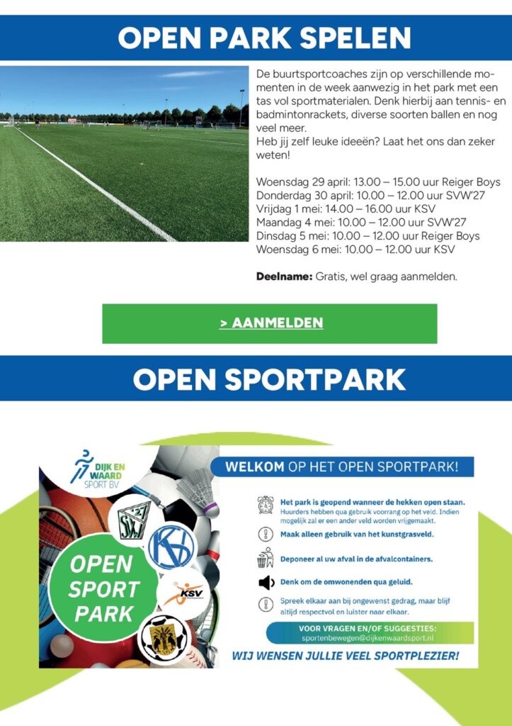 Tijdens de mei vakantie hebben we weer een open sportpark. Daarnaast zullen de buurtsportcoaches van Dijk en Waard Sport BV klaar staan met een gevarieerd aanbod op verschillende locaties in de gemeente Dijk en Waard. Kom in beweging, doe mee en maak er een actieve vakantie van!