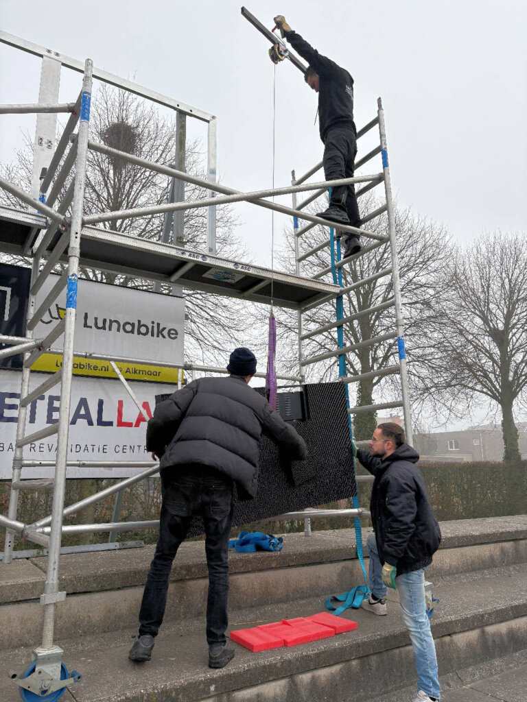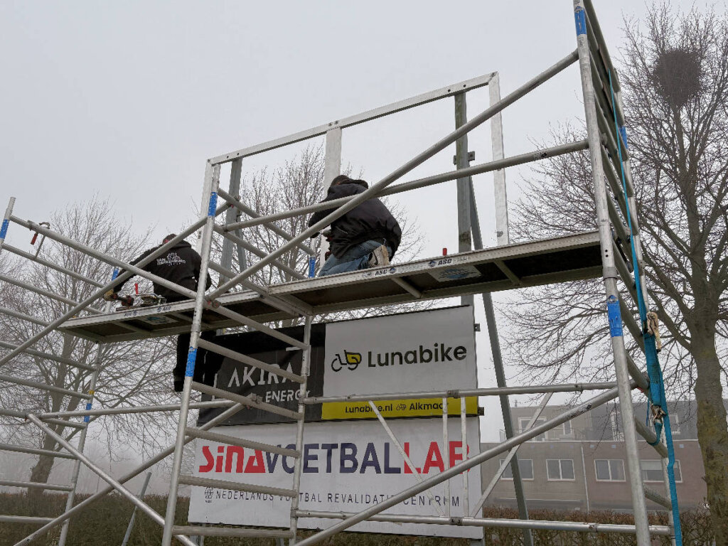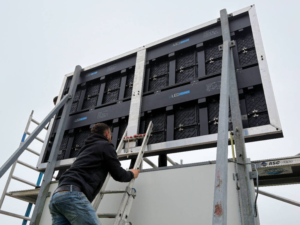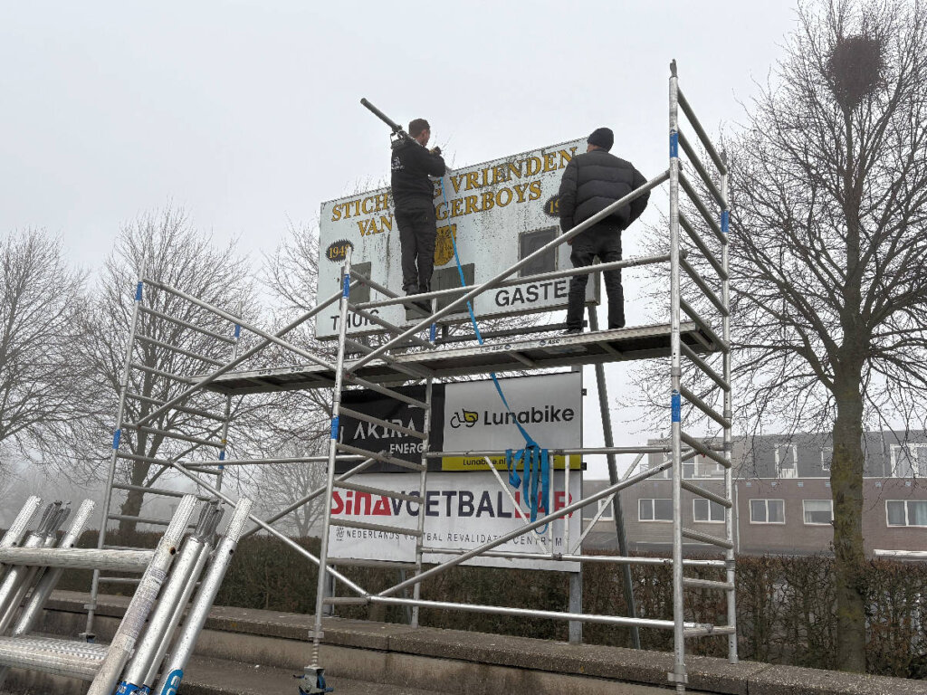 Hieronder de foto’s van de opbouw door LED scores. Ook met behulp van de mannen van de MOT is het oude bord gedemonteerd.