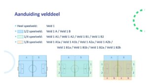 Sommige wedstrijden worden op een half veld gespeeld, maar ook op op 1/4 of zelfs 1/8 deel. Op de schermen op ons complex maar ook op het wedstrijdprogramma op onze website en de voetbal.nl app worden sinds kort een andere benaming hiervoor gebruikt en niet meer links, rechts of voor en achter. Op de afbeelding…